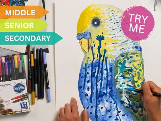 The learning objective for this lesson is to explore colour, shape and movement while learning about the artist Grotti Lotti. Students will create their own acrylic ink bird using different tools to spread the ink in a simple form and manipulating the ink to merge, marble and layer to create shape. Students will then use markers to add smaller details.