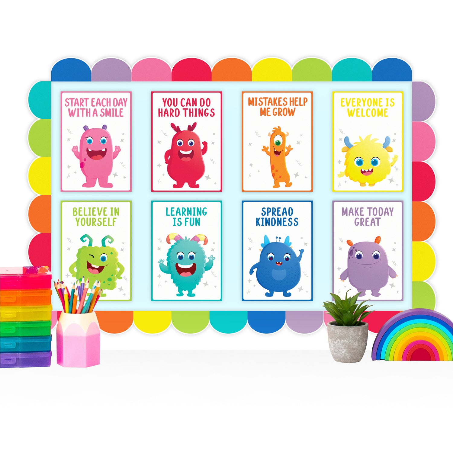 Each set includes eight posters (210 x 297 mm), perfect to display on walls, doors or quiet areas where students can reflect on affirming words. The Eucalyptus Essentials version features calming eucalyptus leaf motifs and neutral tones, fostering tranquillity and focus. The Giggle & Grow set presents bright visuals and friendly characters alongside messages like “You can do hard things”, “Spread kindness”, and “Mistakes help me grow”—ideal for motivating and energising learners.