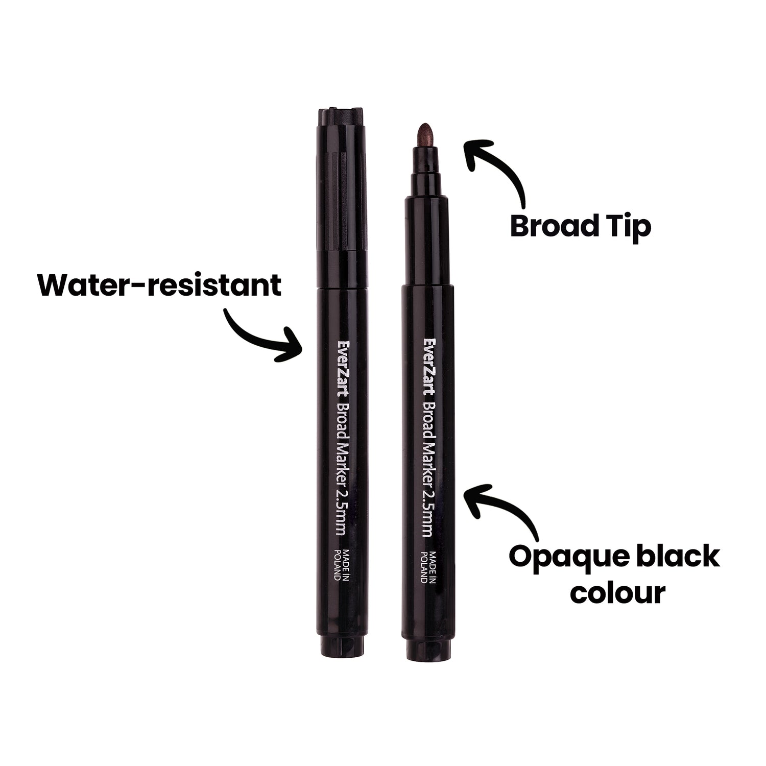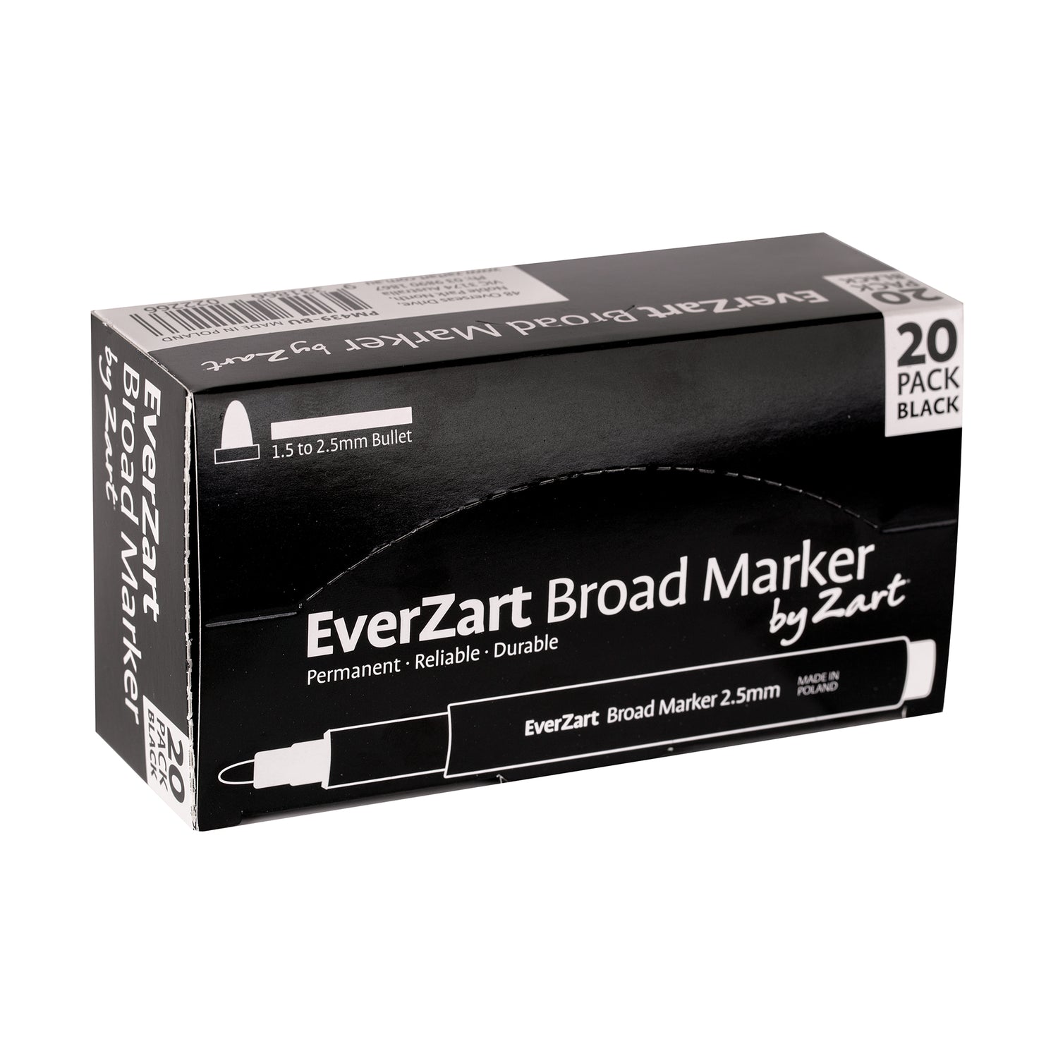 The EverZart Broad Marker Pack of 20 delivers bold, deep black ink with exceptional coverage and permanence on a wide range of surfaces. Designed for classroom and artroom use, these markers feature a 1.5–2.5mm broad bullet tip that allows for smooth writing and bold line creation. The ink is water-resistant, low odour, and xylene-free, offering a safer and more comfortable experience for students and teachers. With a smaller round barrel designed for easy grip and control, these markers are suitable for all abilities and provide outstanding performance and value when compared to other leading brands.